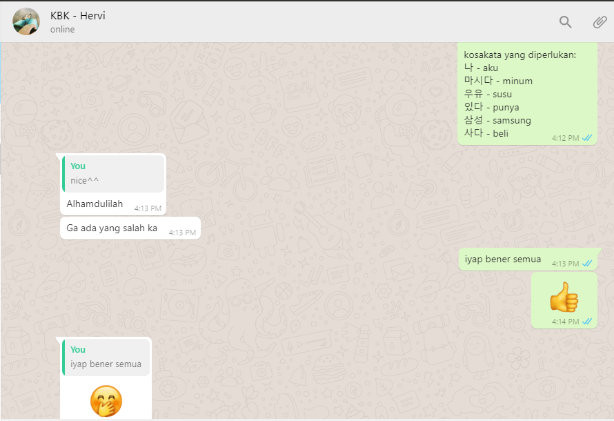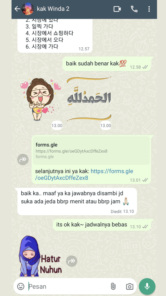 –> Kalau belajarnya rutin, biasanya 2 minggu sudah bisa buat kalimat Korea dan menguasai level 1 bahasa Korea
